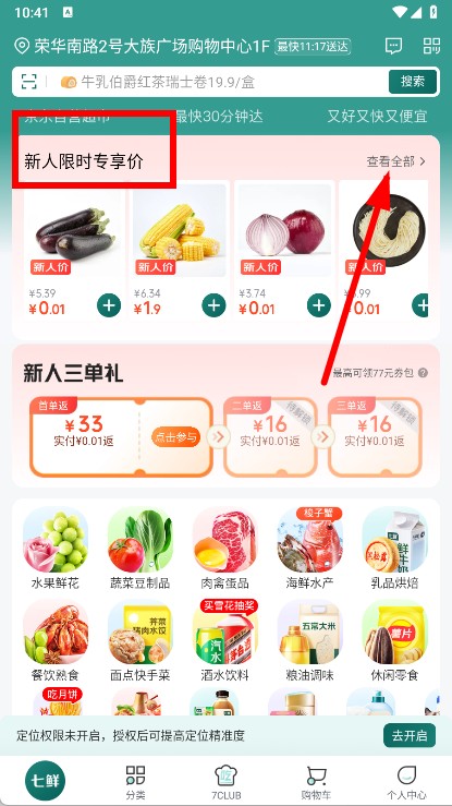 2、找到新人限时专享价板块,点击查看全部按钮,进入新人专享福利页面。