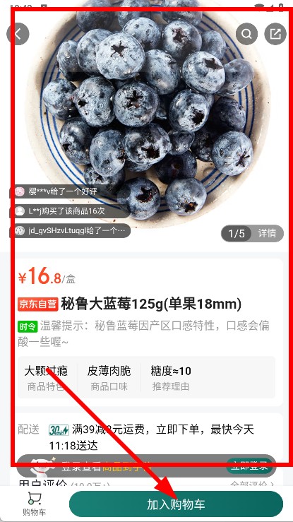 4、确认商品信息后,点击底部的加入购物车按钮,即可完成秘鲁大蓝莓的选购操作。