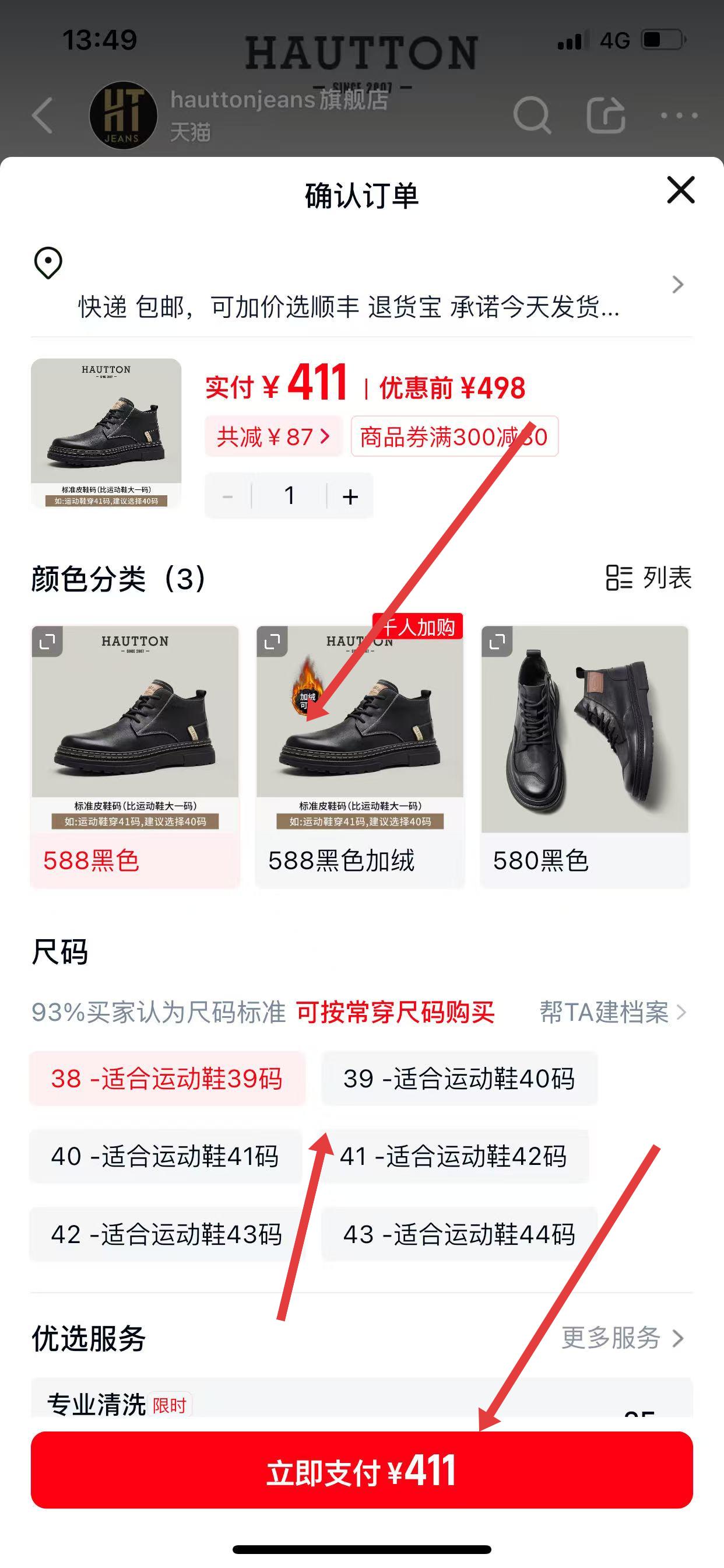 3、在确认订单页面,确认收货地址、商品规格和价格等信息无误后,点击立即支付。