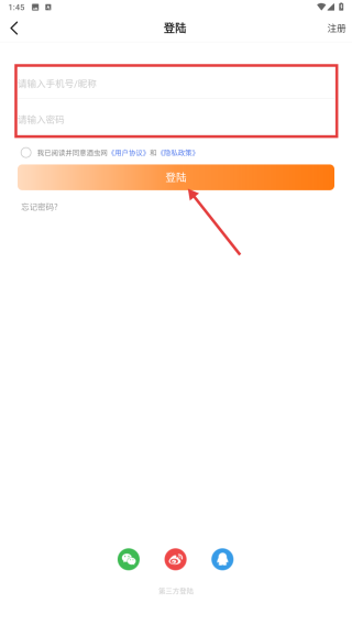 4、输入手机号码/昵称和登录密码后点击登录按钮,完成账号登录操作。