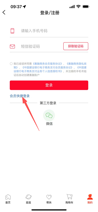 3、在登录/注册页面,点击会员快捷登录,进入快捷登录页面。