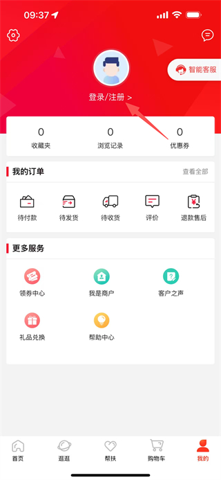 2、在个人中心页面,点击登录/注册区域,进入登录界面。