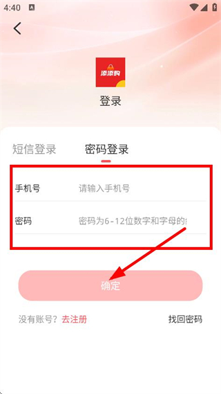4、在密码登录界面,输入手机号、密码,点击确定,完成登录操作。