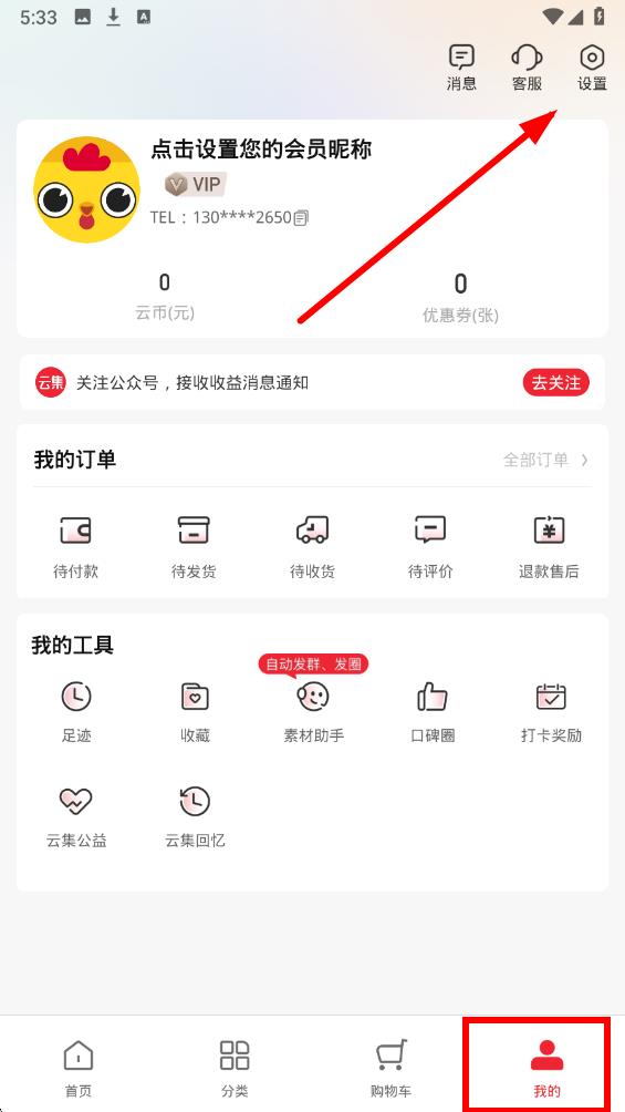 1、打开云集app,进入界面后点击底部导航栏最右侧我的选项,点击页面右上角的设置图标。