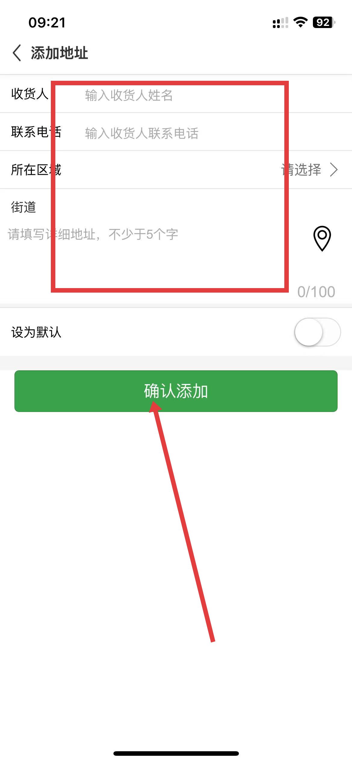 4、填写完信息后,点击确认添加按钮,即可成功添加收货地址。