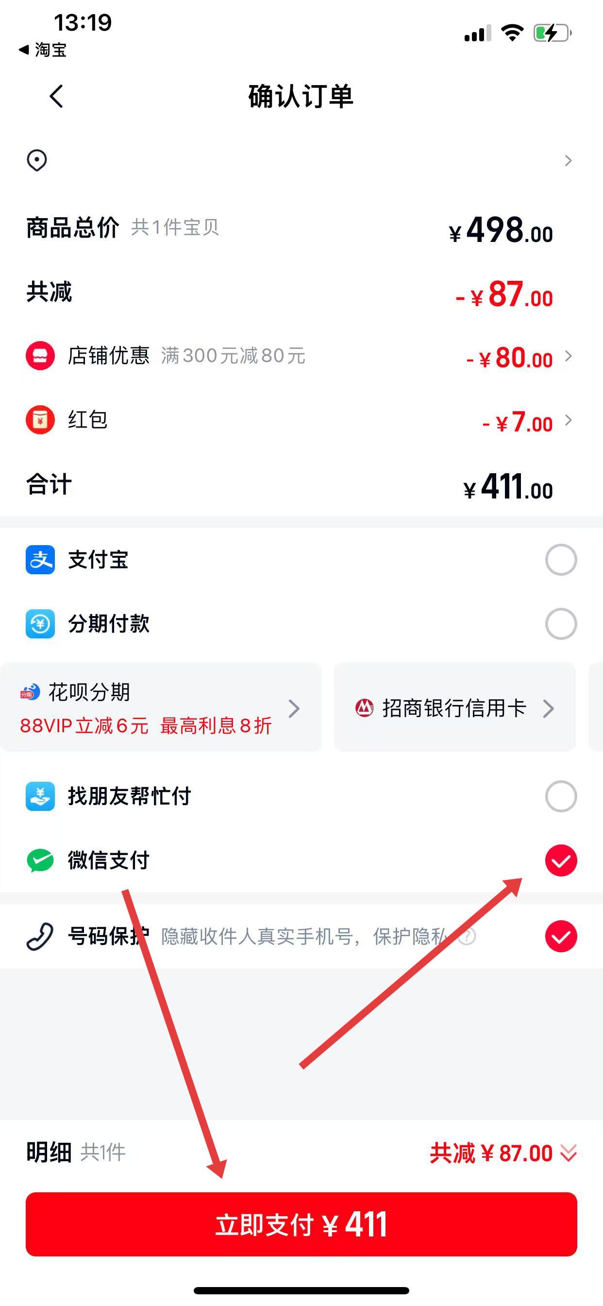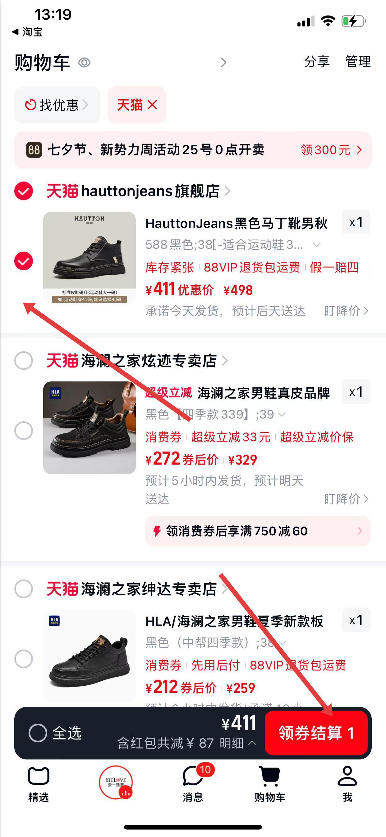 1、在天猫购物车勾选商品,点击领券结算,进入确认订单页。