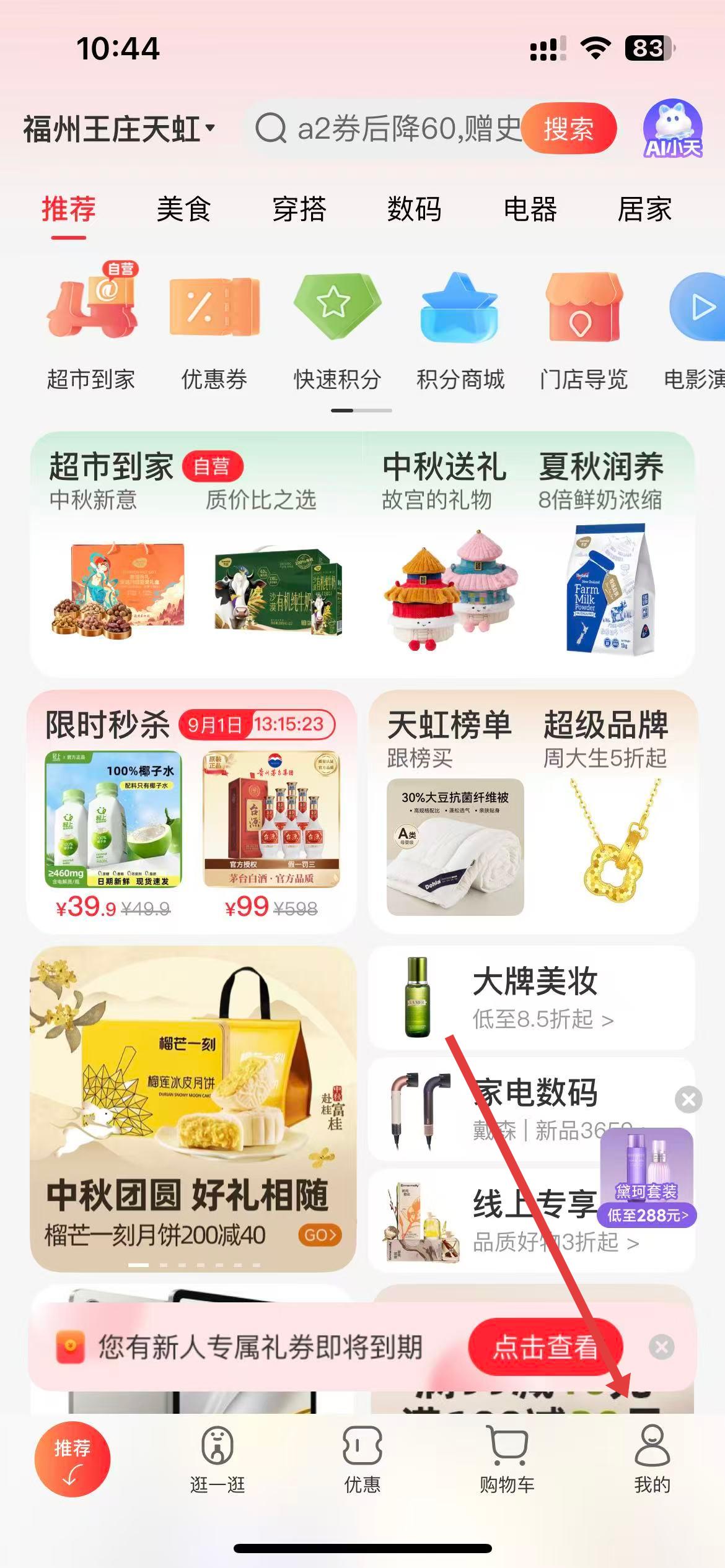 1、打开天虹超市购物app进入首页后,在底部导航栏中点击我的选项,进入个人页面。