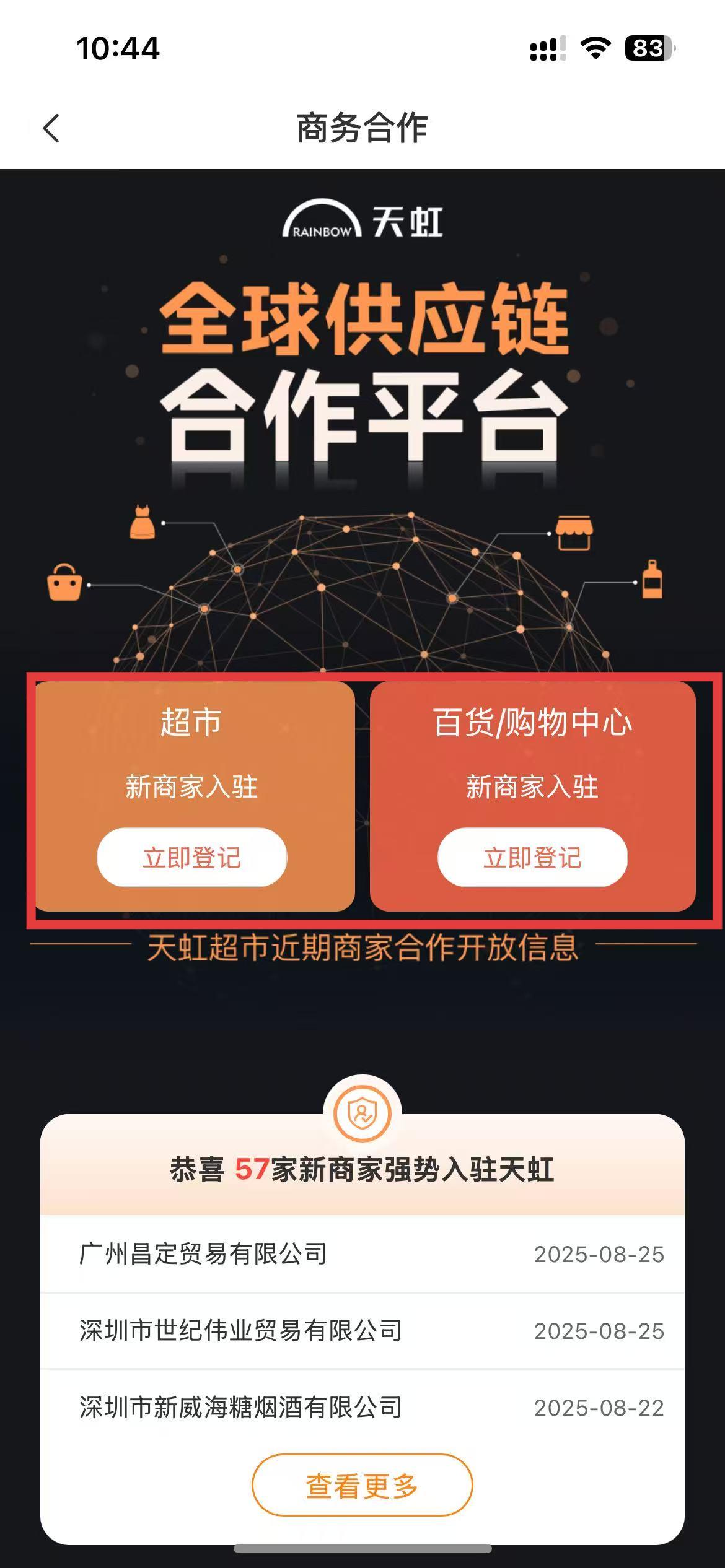 3、若您是超市新商家,点击超市板块下的立即登记按钮,若您是百货购物中心新商家,则点击百货购物中心板块下的立即登记按钮,按后续提示完成入驻登记。