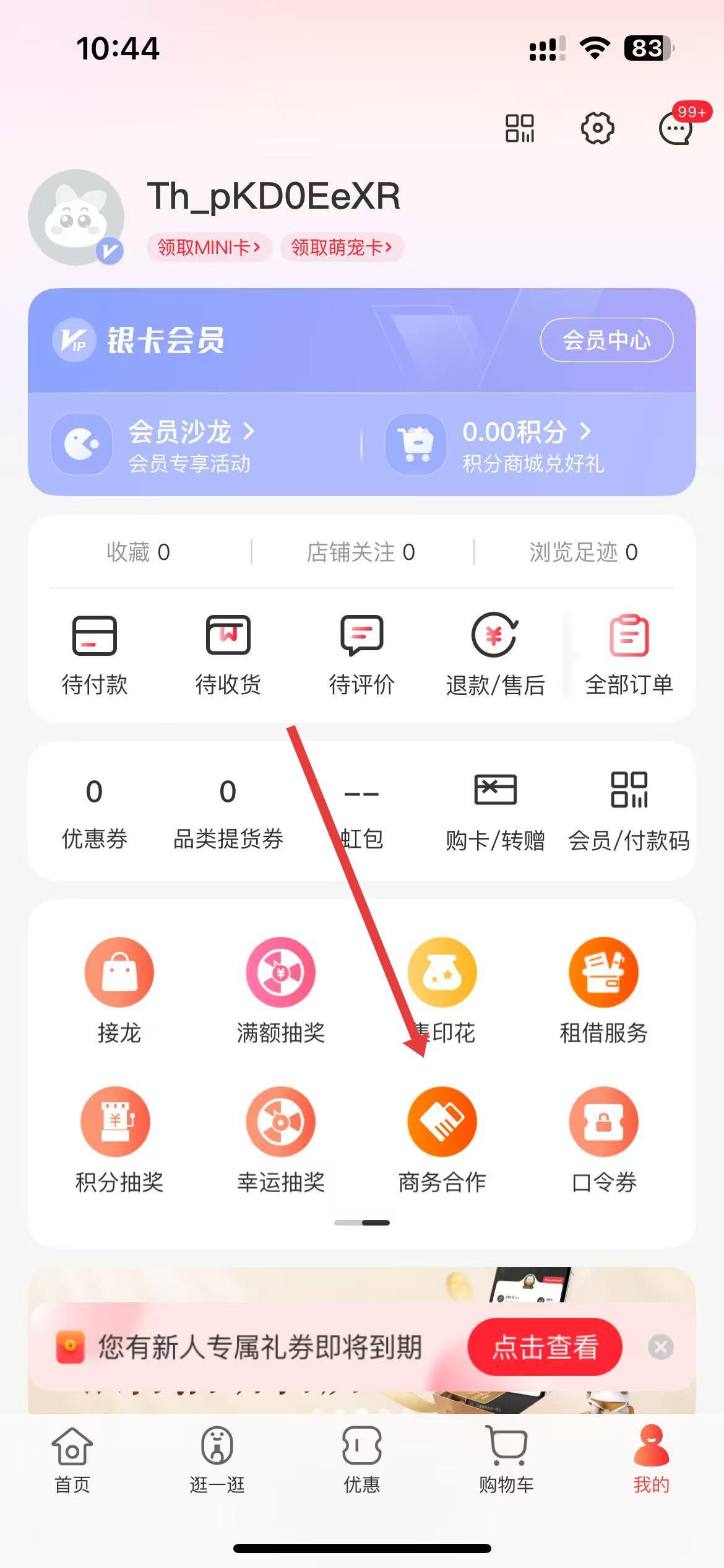 2、在个人页面里,向下滑动屏幕,找到商务合作图标,点击该图标进入商务合作相关界面。