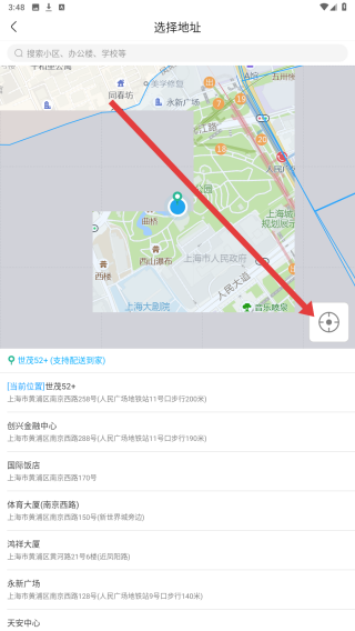 3、在选择地址的地图界面,点击右侧定位按钮,获取设备当前位置,生成当前地址,用于盒马提供门店服务。