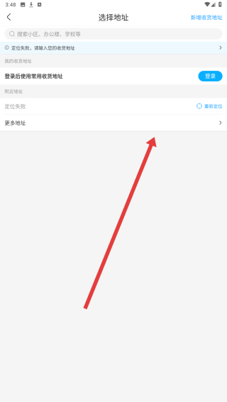 2、进入选择地址页面,虽显示定位失败,仍可通过页面功能添加或选择地址,推进定位及地址设置流程。