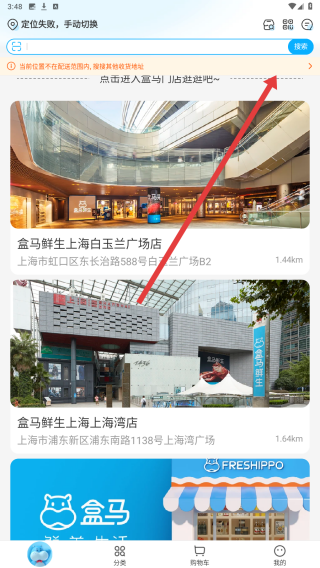 1、在盒马定位失败页面,点击右上角箭头指向的区域,进入选择地址界面,准备设置收货或服务地址,解决定位问题。