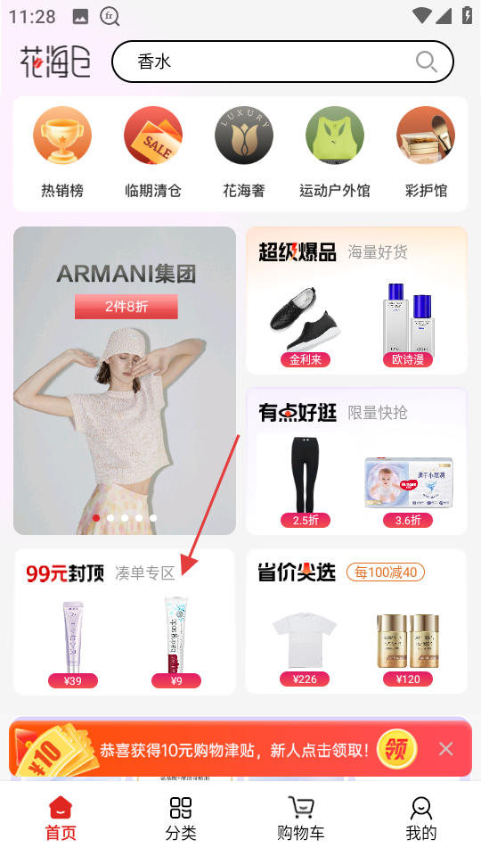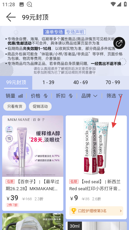1、在首页,点击99元封顶凑单专区,进入99元封顶商品列表页。