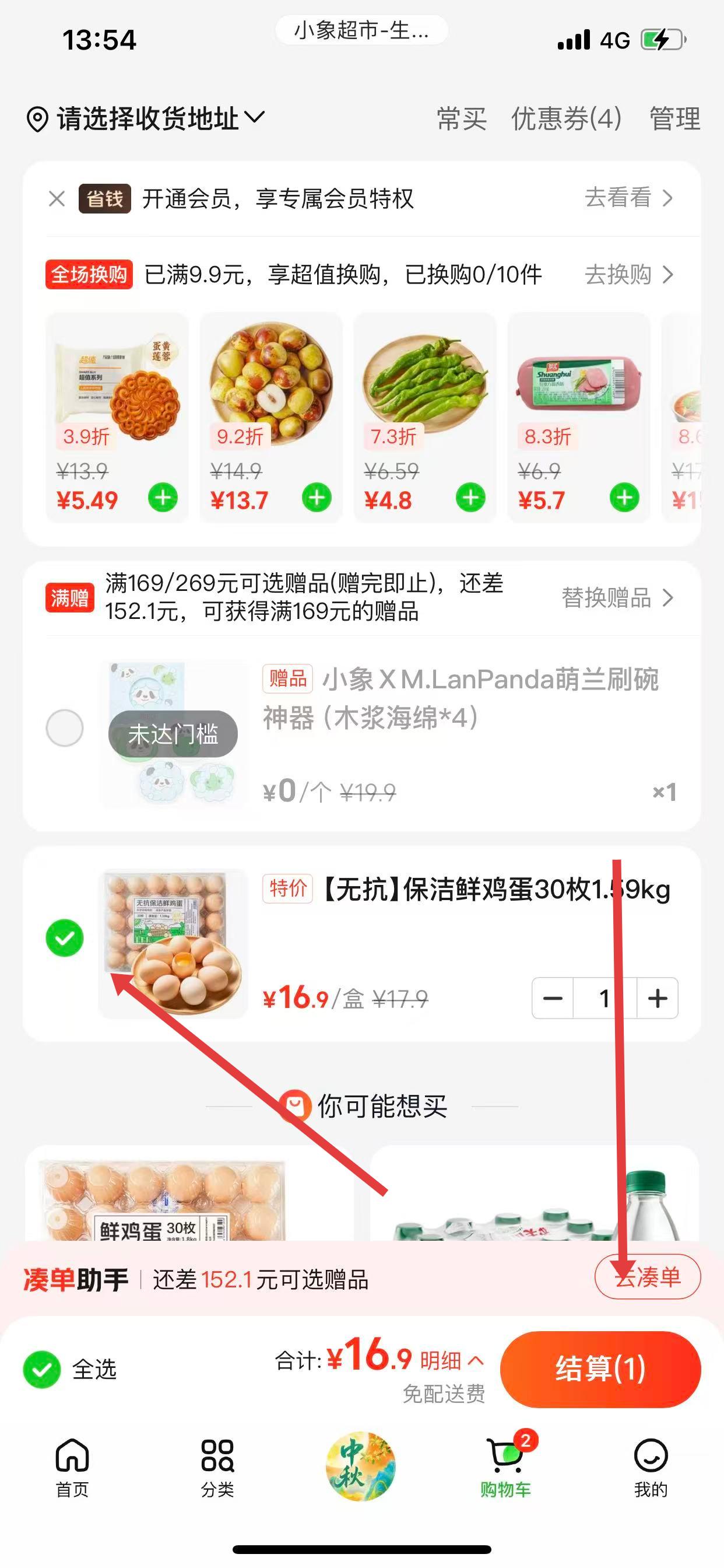3、进入购物车页面,将想要购买的商品打钩,点击结算。