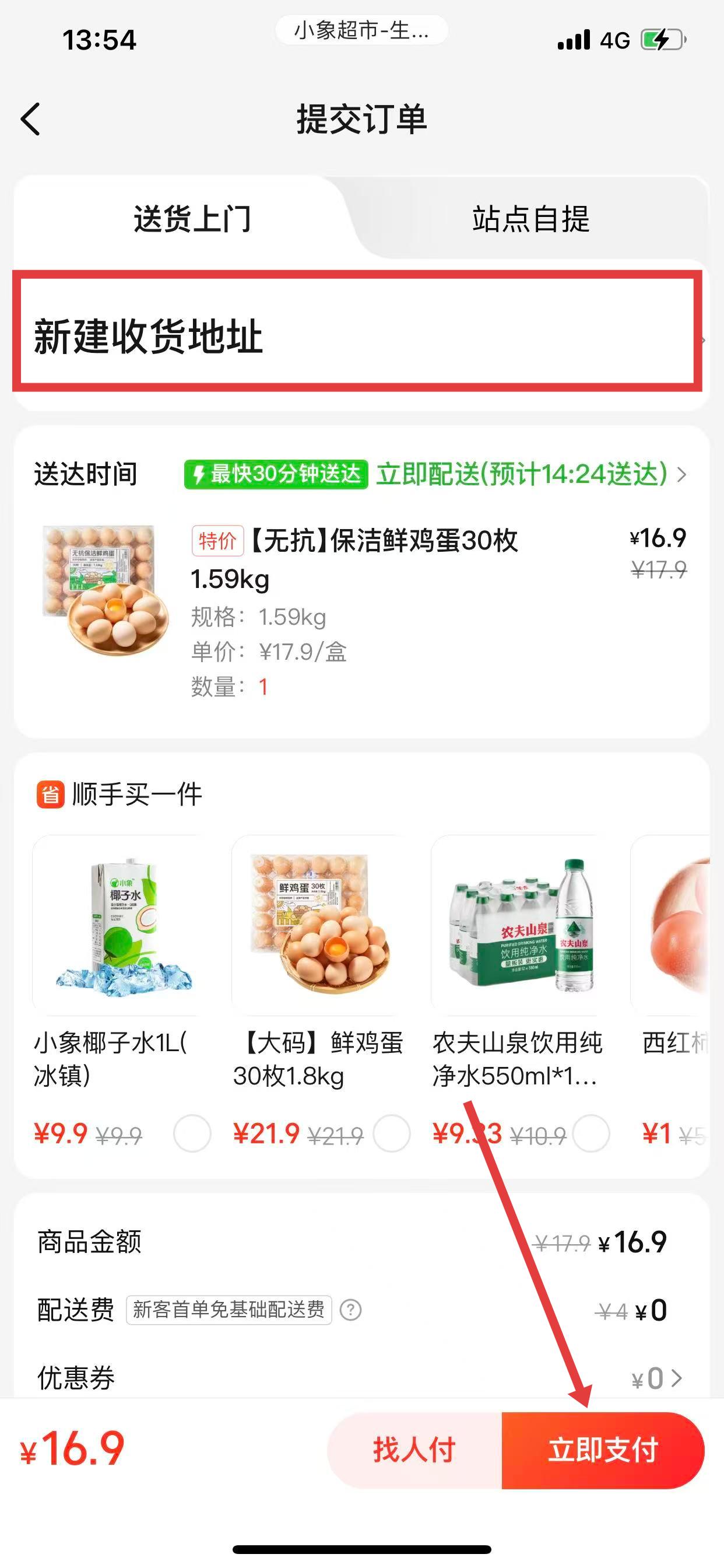 4、进入提交订单页面,点击新建收货地址填写收货信息,点击立即支付,即可完成下单。