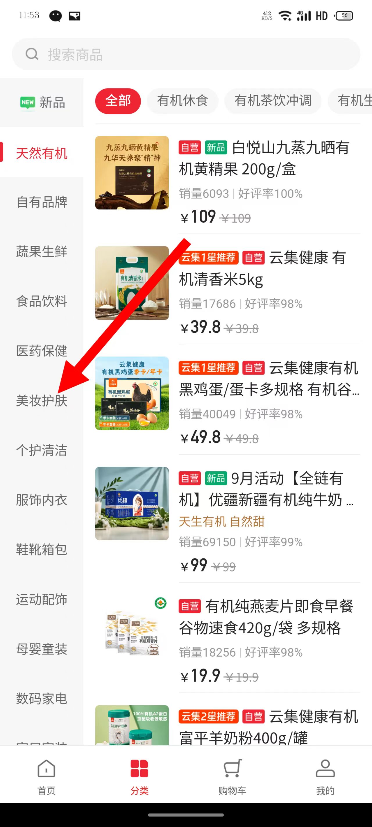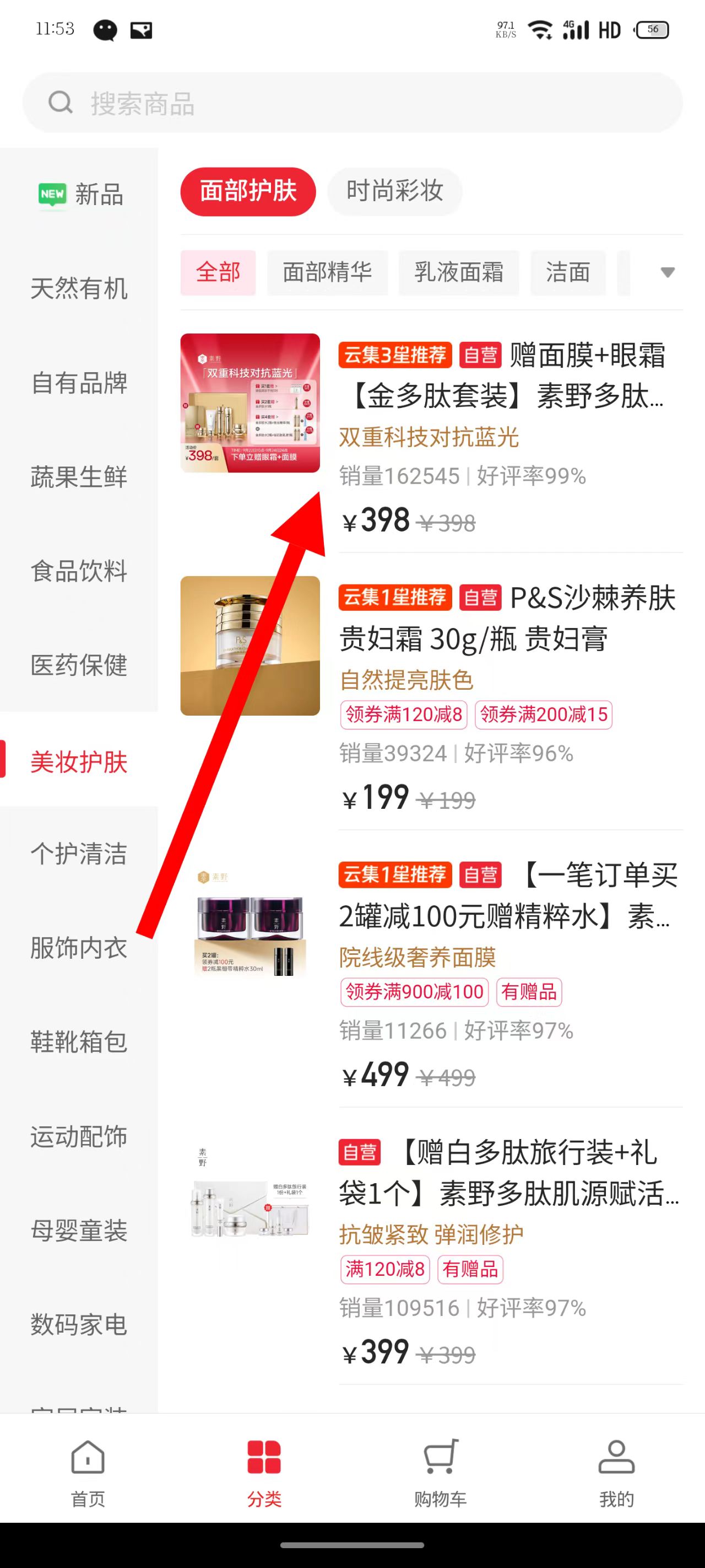 2、在分类页面,点击美妆护肤分类,进入美妆护肤商品列表页。