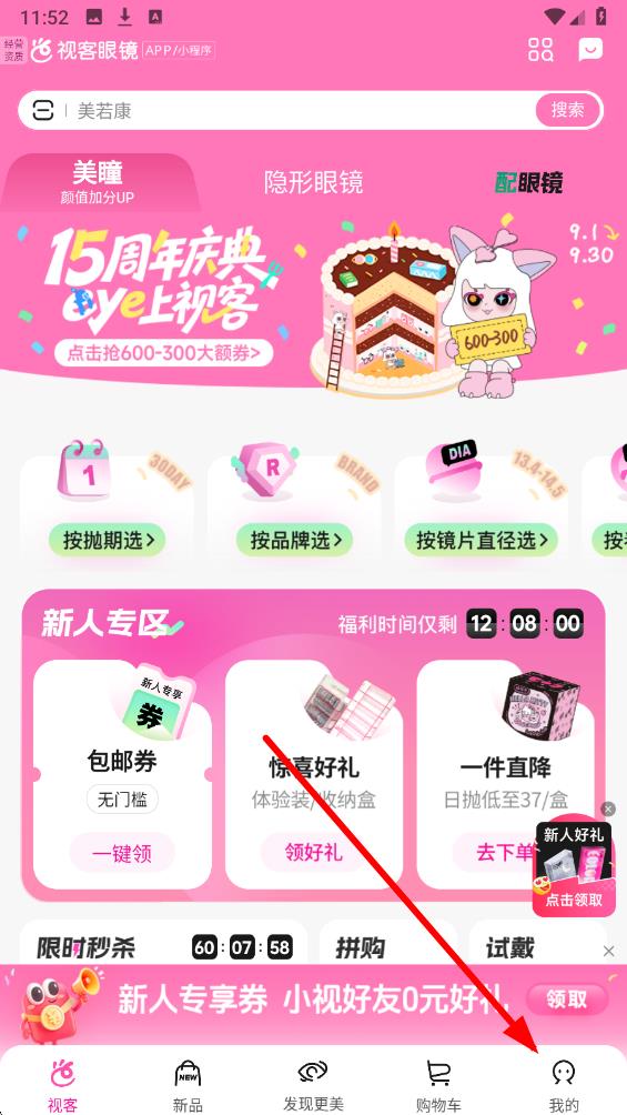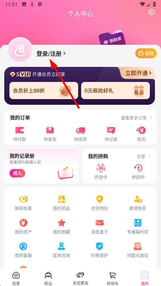 1、打开视客眼镜网app,进入首页后,点击底部导航栏最右侧的我的选项,进入个人中心页面。