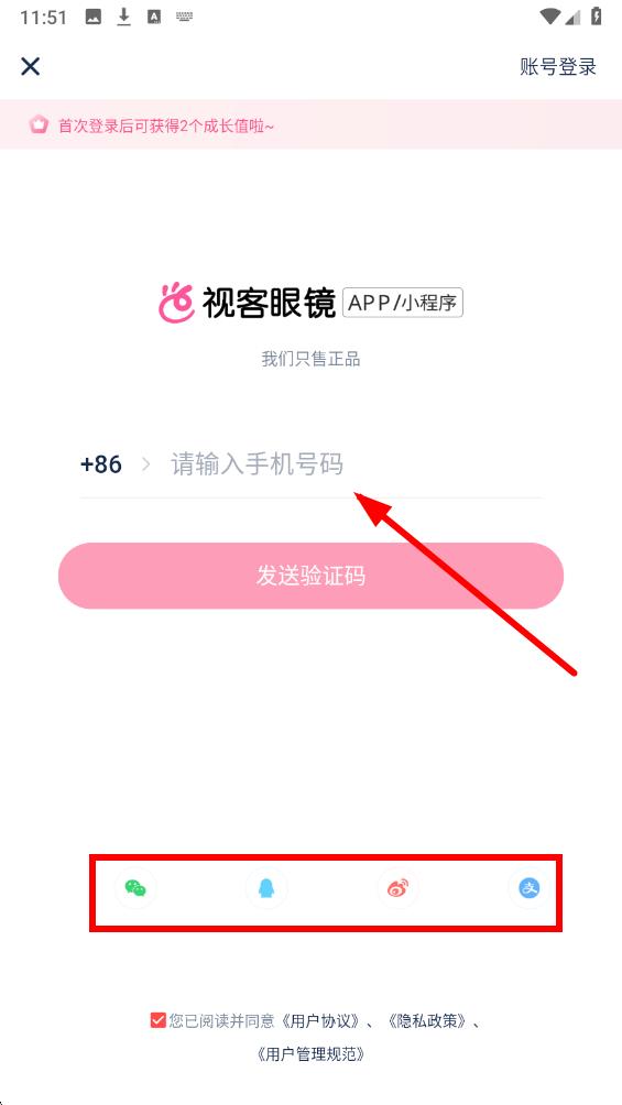 3、在账号登录注册界面,可以选择在请输入手机号码框中输入手机号通过验证码完成注册,也可以点击下方的第三方登录图标快速注册。