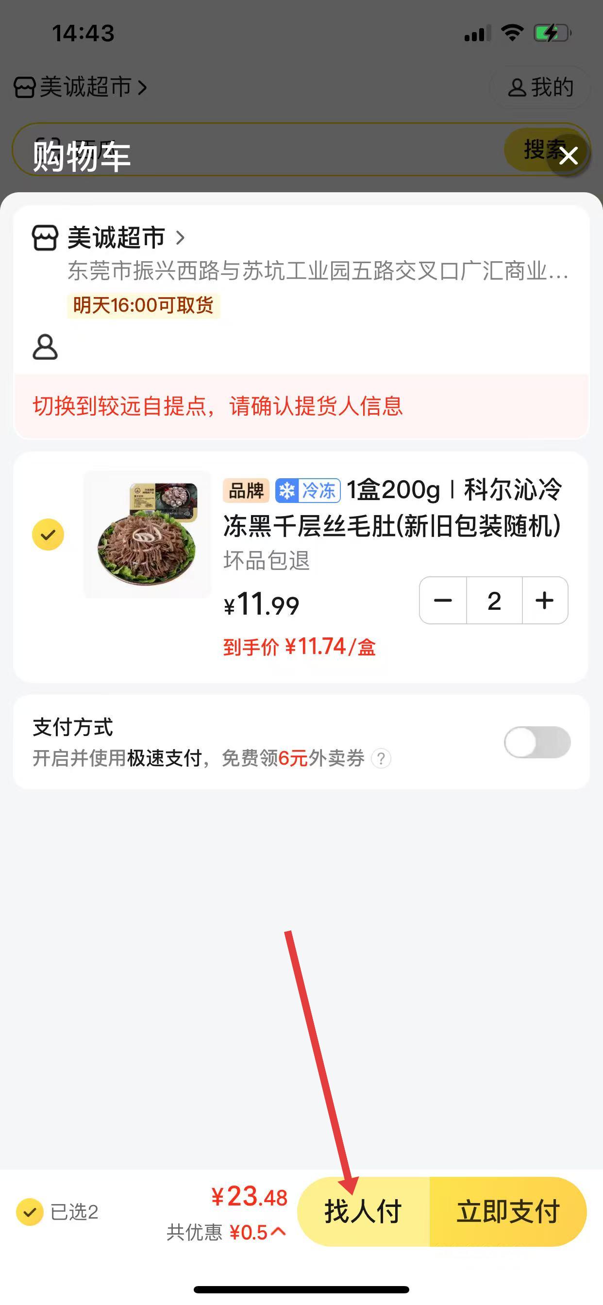 2、在支付页面,点击找人付按钮,进入亲友代付界面。