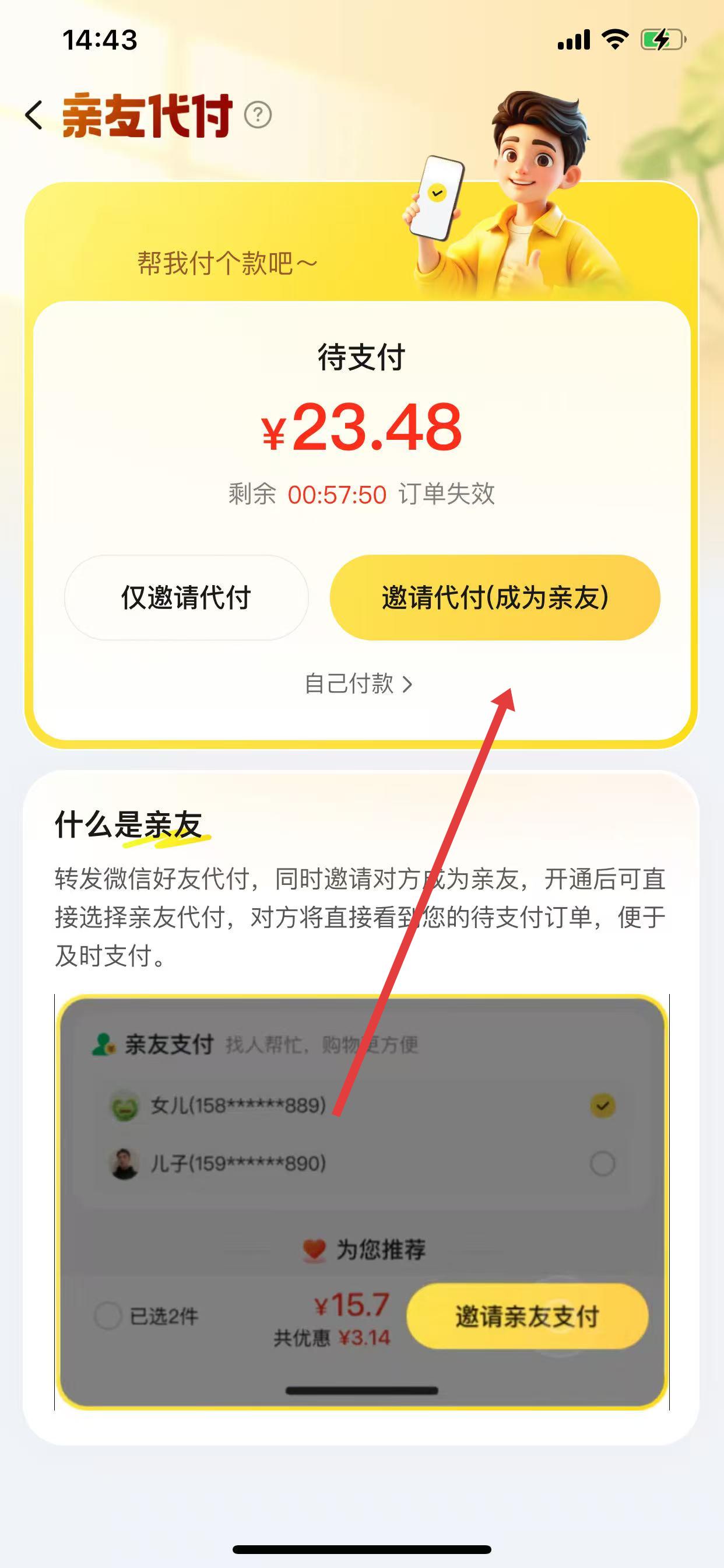 3、选仅邀请代付或邀请代付,分享链接给代付人。