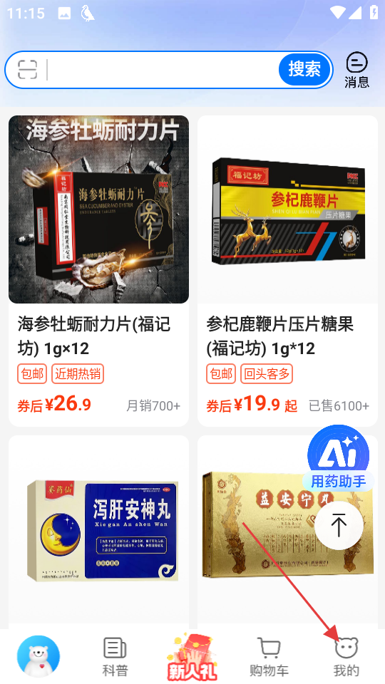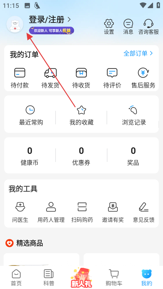 1、在方舟健客网上药店首页,点击底部我的,进入个人页面。