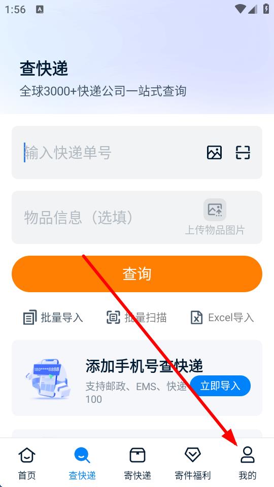 1、打开快递100应用,点击底部导航栏最右侧的我的选项。
