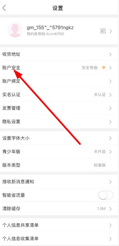 3、在设置界面里,找到并点击账户安全选项。