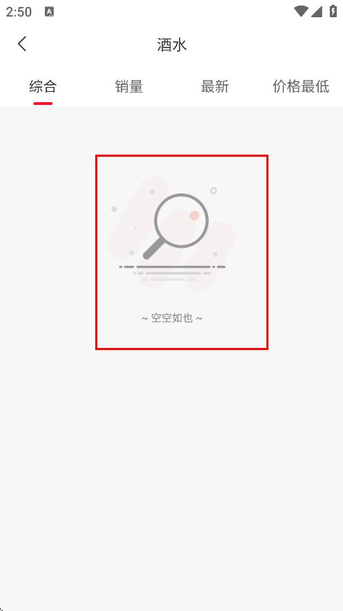 4、在酒水商品列表页面,可查看酒水类商品,当前显示空空如也,表示暂无酒水商品。