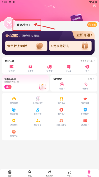 2、在个人中心,点击登录/注册区域,进入登录方式选择界面。
