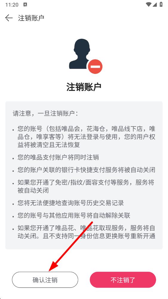 4、仔细阅读注销账号提示信息,确认注销操作后果后,点击确认注销,即可完成账号注销。