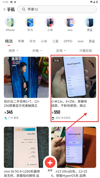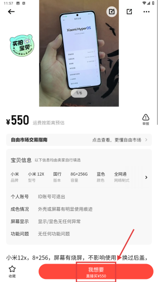 3、找到小米12x相关商品如屏幕有烧屏、换过后盖但不影响使用,售价550元,点击进入商品详情页。