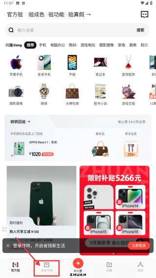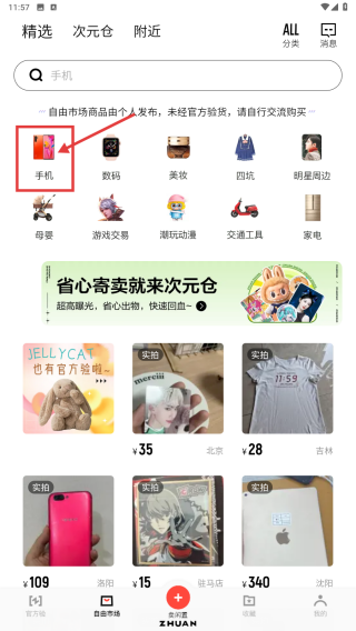 1、打开二手交易APP,点击底部转选项,进入商品分类等相关页面。