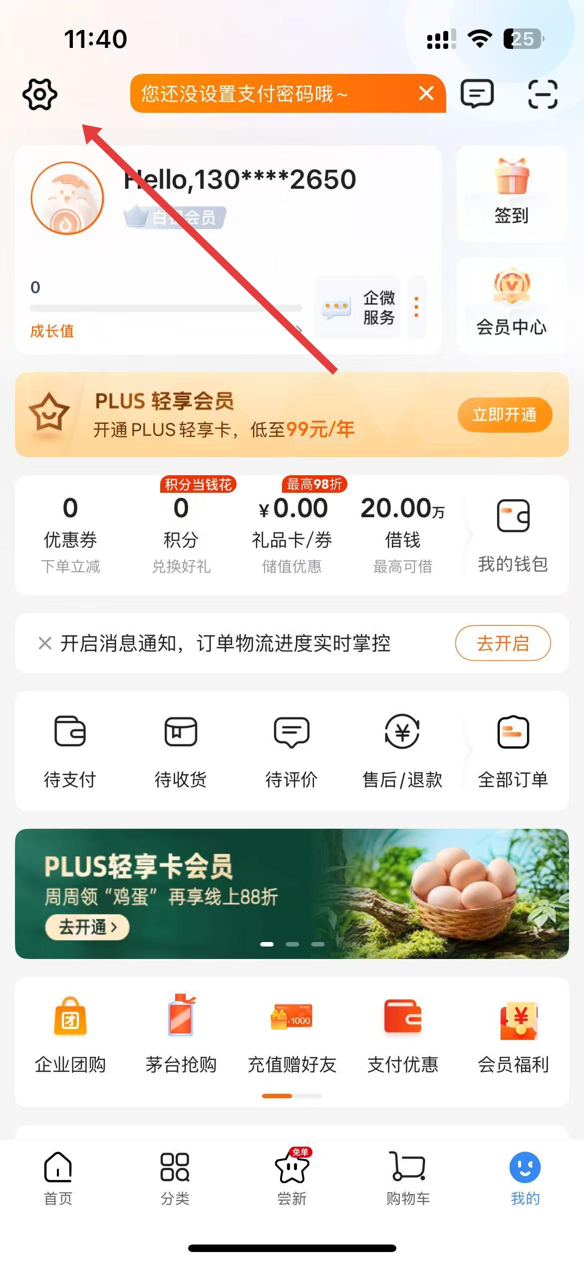 1、打开多点购物APP,点击底部导航栏我的,进入个人页面点击页面左上角设置图标,进入设置界面。