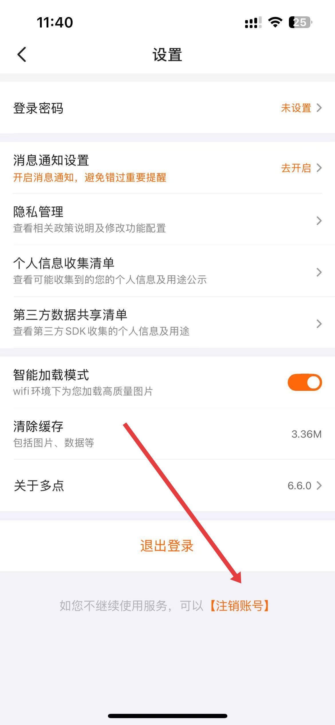2、在设置页面中,下滑找到注销账号选项,点击进入账号注销相关页面。