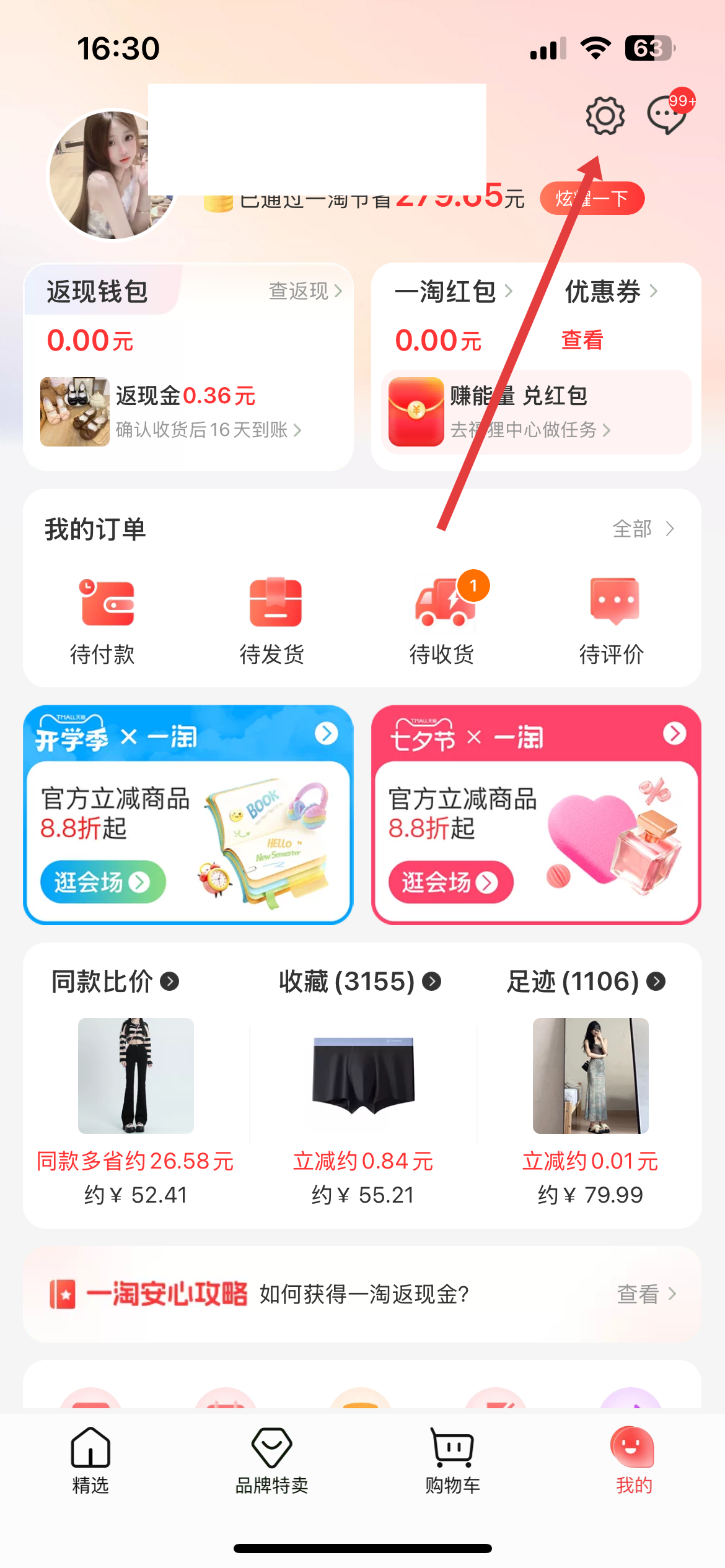 1、进入一淘APP后,点击底部导航栏中我的选项,在页面右上角找到设置,并点击进入设置页面。