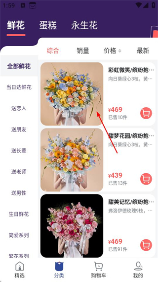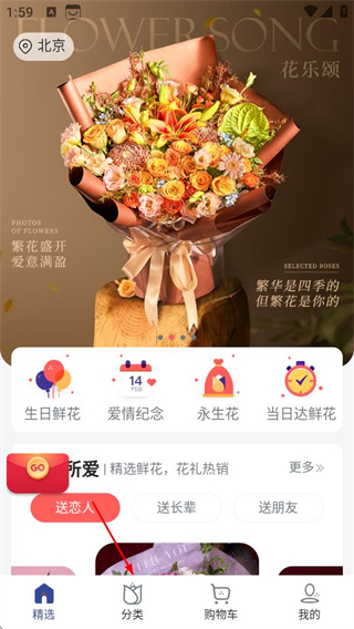 1、在花乐颂鲜花首页,点击底部分类选项,进入分类页面。