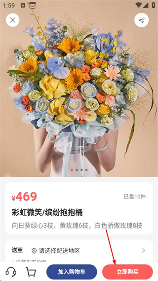 3、在商品详情页面,点击立即购买按钮,可完成鲜花购买操作。