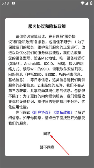 1、在服务协议和隐私政策弹窗中,点击同意,进入应用。
