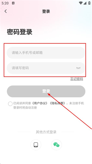 4、在密码登录界面,填写手机号或邮箱和密码,点击登录完成账号登录。