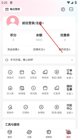 2、在我的页面,点击前往登录/注册选项,进入登录页面。