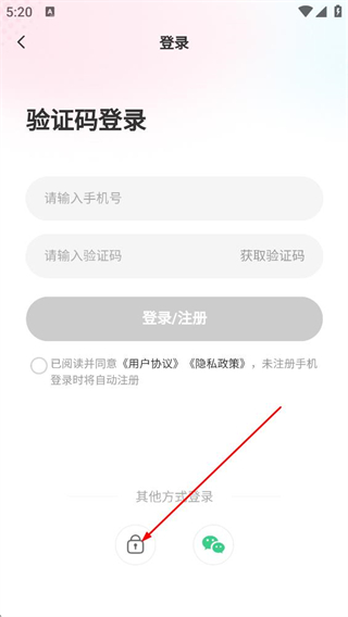 3、在验证码登录页面,点击密码登录对应的图标,切换至密码登录界面。