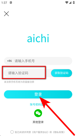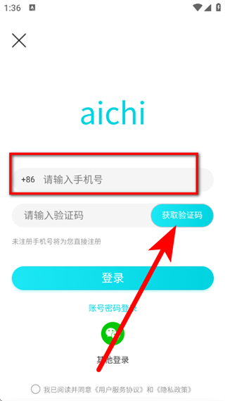 3、在登录页面,输入手机号,点击获取验证码。