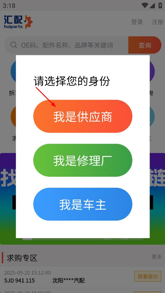 1、打开汇配软件,在弹出的“请选择您的身份”提示框中,根据自身情况选择对应的身份选项,进入软件首页。