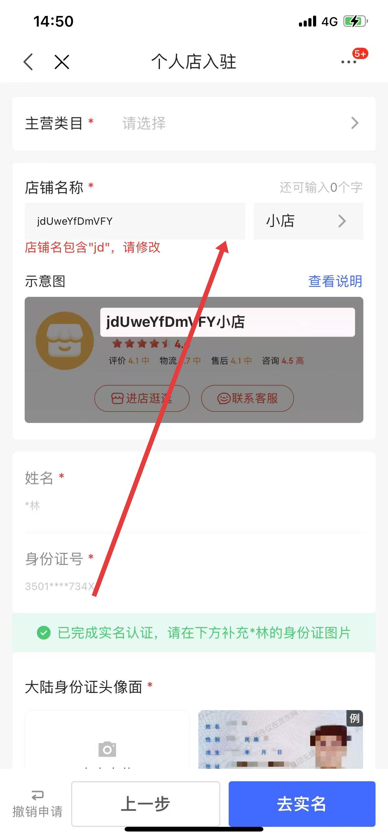 3、进入个人店入驻页面,按要求填主营类目、店铺名称,完善姓名、身份证号等信息,上传身份证图片,完成后提交申请。