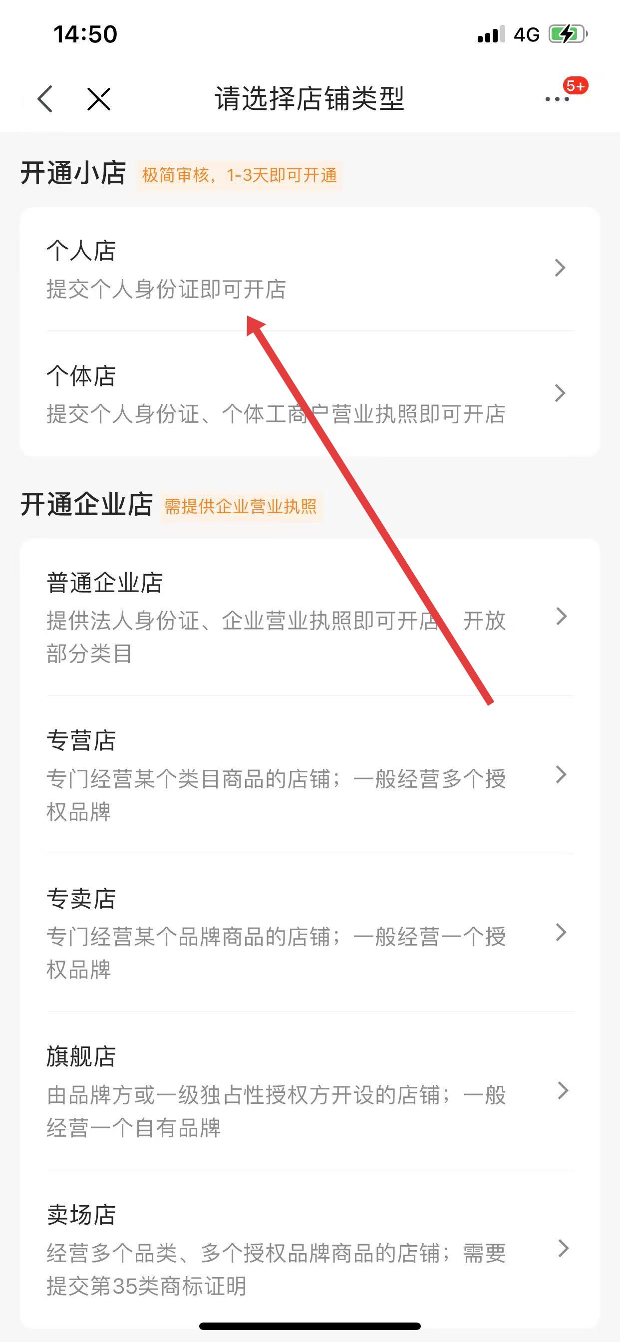 2、在请选择店铺类型界面,根据自身情况选,比如想开个人店,就点击个人店选项。