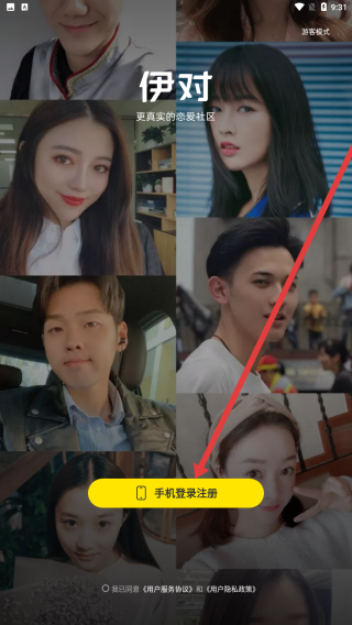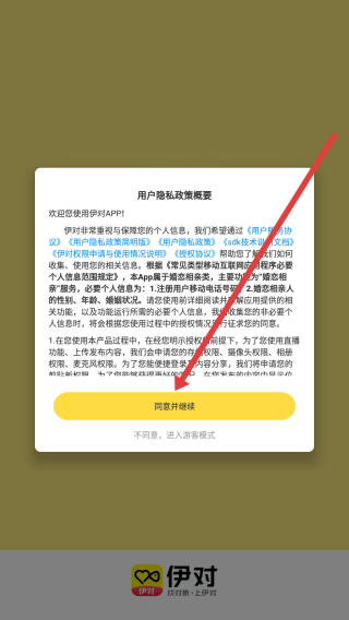 1、在打开伊对app后,点击弹窗中的同意并继续按钮后,进入app使用。