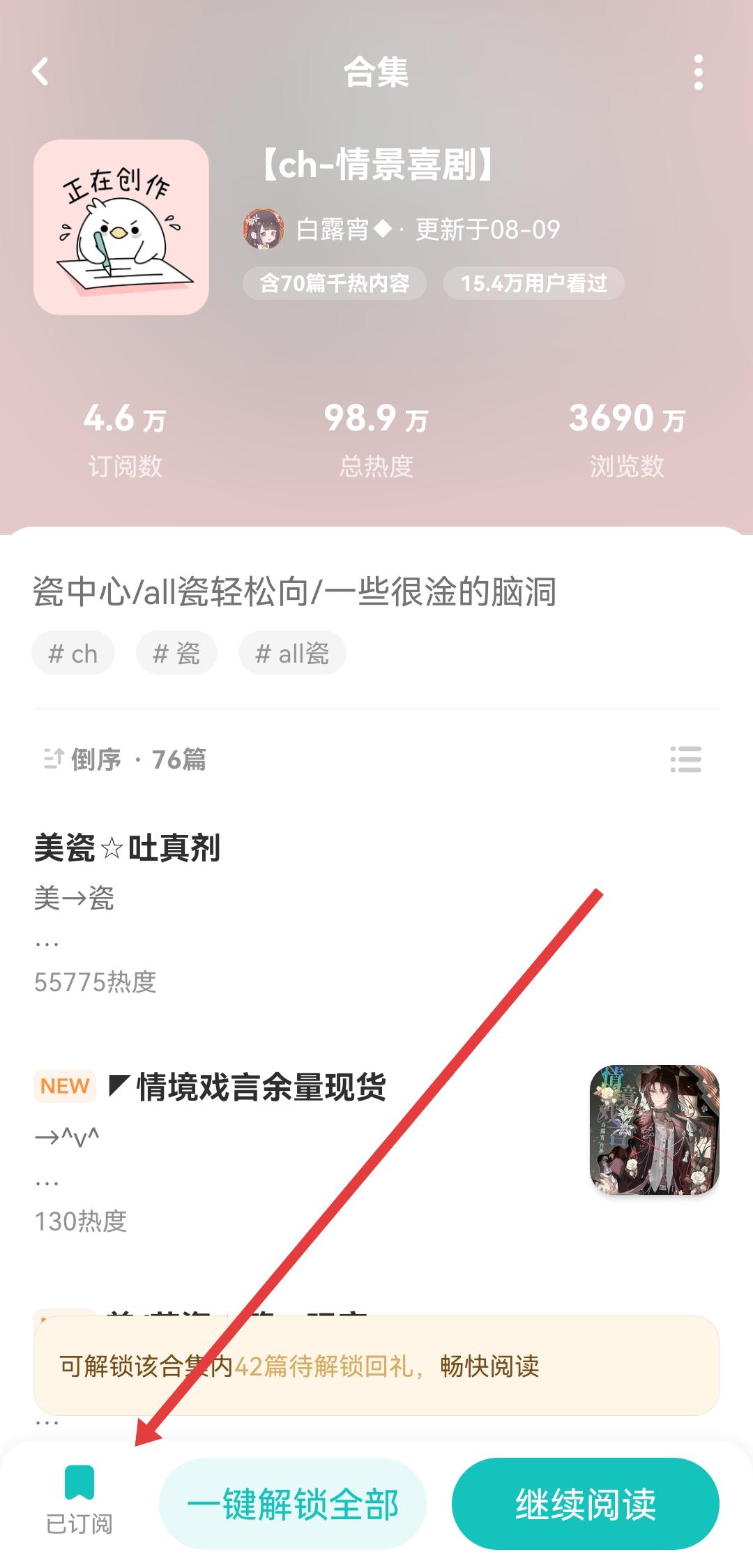 2、在已订阅的合集中,找到需要取消订阅的合集并点击进入其详情页面,在页面底部找到已订阅按钮并点击。