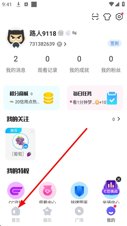 1、打开CC直播应用,点击底部导航栏中的首页选项,进入首页界面。