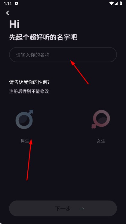 1、打开月色佳人,点击开始使用,进入注册流程,先起好听名字,选性别,点击下一步。