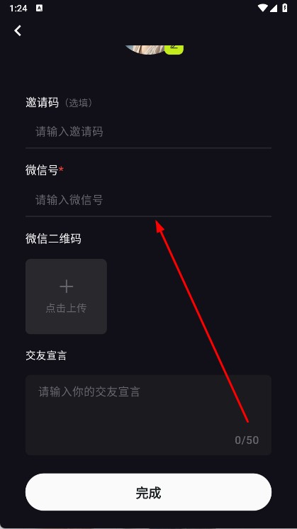 3、填邀请码、微信号,上传微信二维码,写交友宣言完成后,参与趣味交友活动。